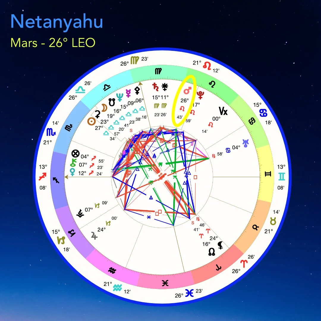 And wouldn’t you know it, Benjamin Netanyahu also has his Mars at 26° LEO, the exact same point where Trump has his. They are Mars-aligned and assert themselves in similar ways.