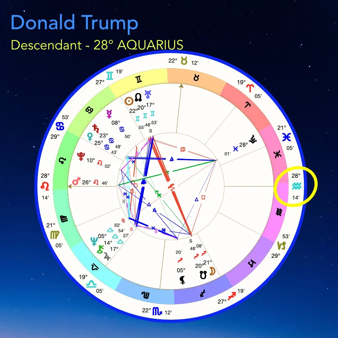 Donald Trump has his Descendant at 28° of Aquarius. Which means that his Ascendant is 28° of Leo. This is a fundamental, extremely important axis in the chart. His Mars (the planet of war, aggression, combat) also sits at 26° LEO. This is a close eclipse hit for him, on two counts.